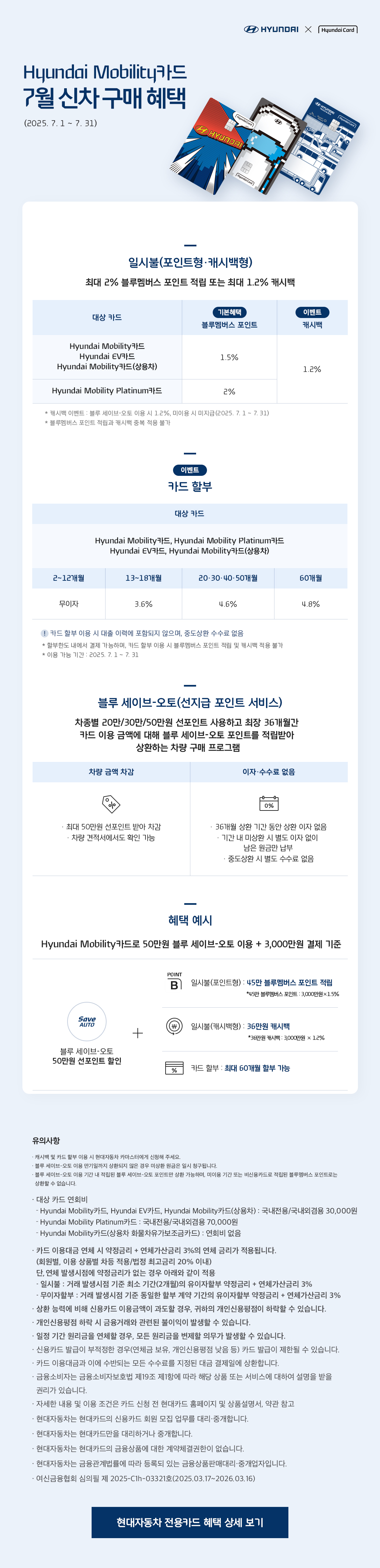 | Hyundai Mobility카드/EV카드/상용차 | 1.5% | 1.2% (블루 세이브-오토 이용 시) | 포인트/캐시백 중복 불가 |