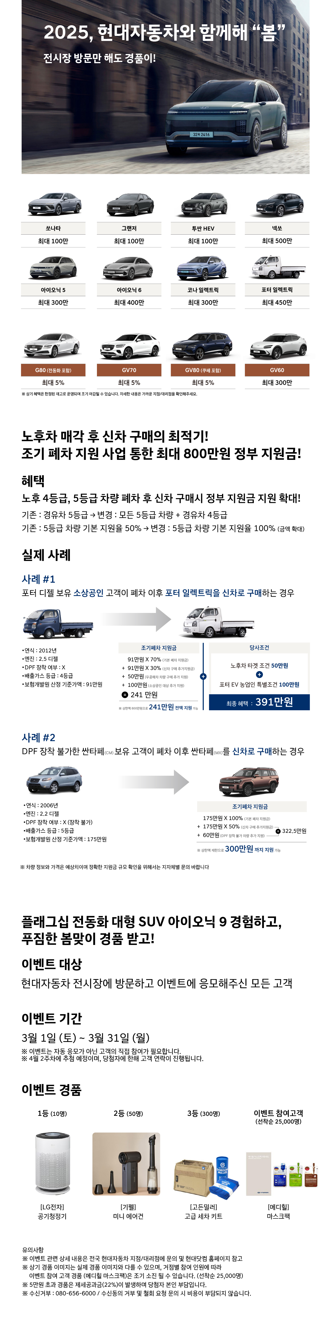 현대자동차가 2025년 봄을 맞아 고객 여러분을 위한 특별한 이벤트를 준비했습니다. 전시장 방문만으로도 푸짐한 경품의 기회를 잡을 수 있는 이번 행사에서는 다양한 차종에 대한 파격적인 할인 혜택과 함께 노후차 매각 후 신차 구매를 위한 정부 지원 프로그램도 함께 소개하고 있습니다.