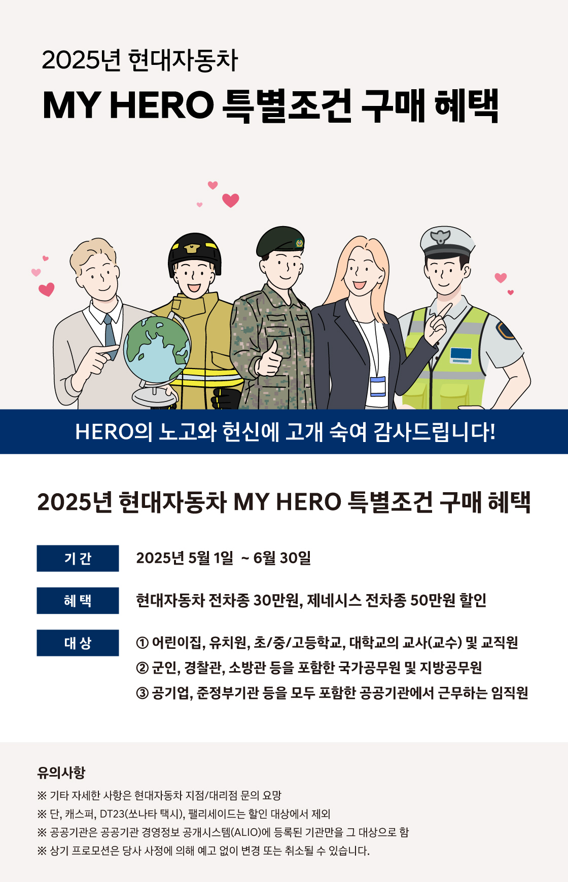 2025년 5월 현대자동차 MY HERO 특별 할인 프로모션 완벽 정리 - 교사, 공무원, 군인을 위한 특별 혜택!