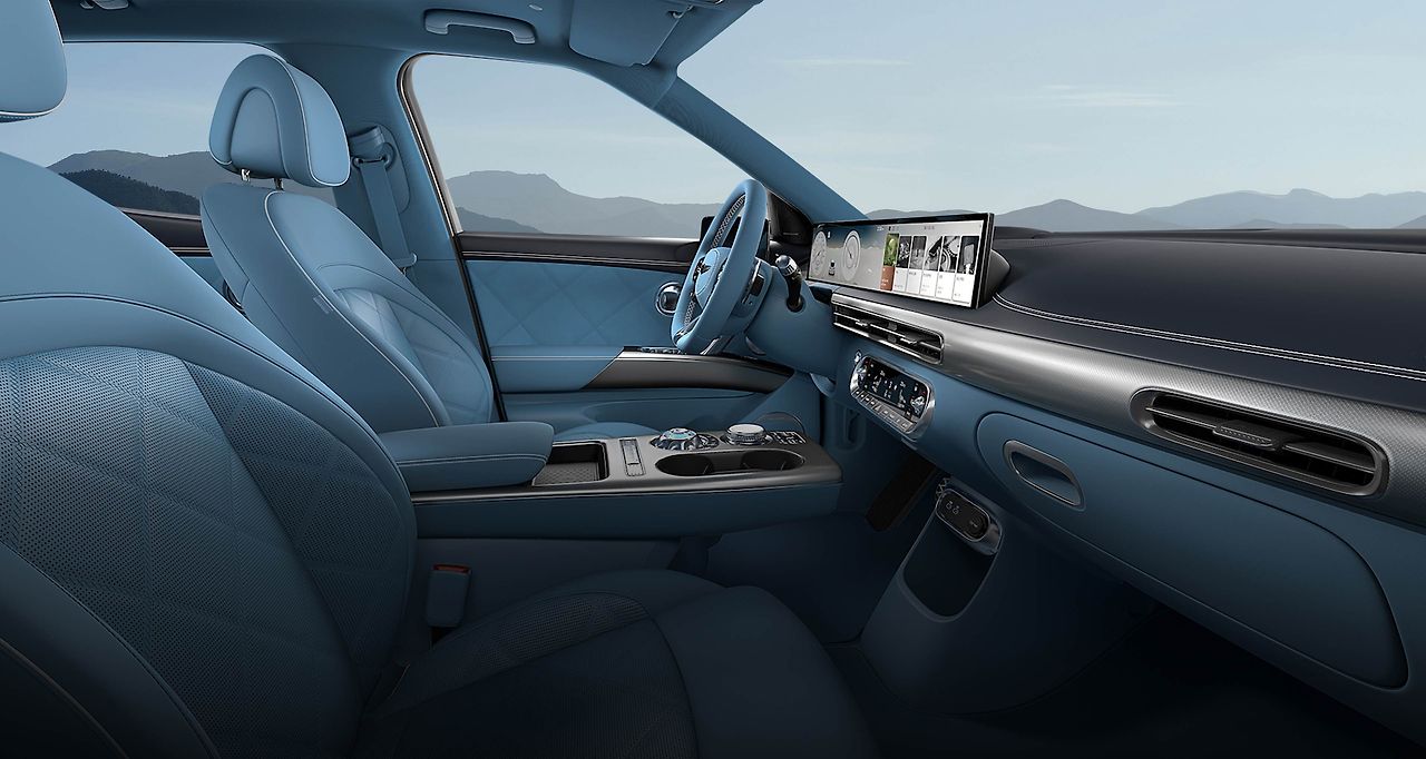 GV60의 실내는 전기차 전용 플랫폼 E-GMP의 장점을 극대화한 공간입니다. 센터 콘솔이 공중에 떠 있는 듯한 독특한 브릿지 타입 디자인은 1열에 탁 트인 개방감을 선사해요.